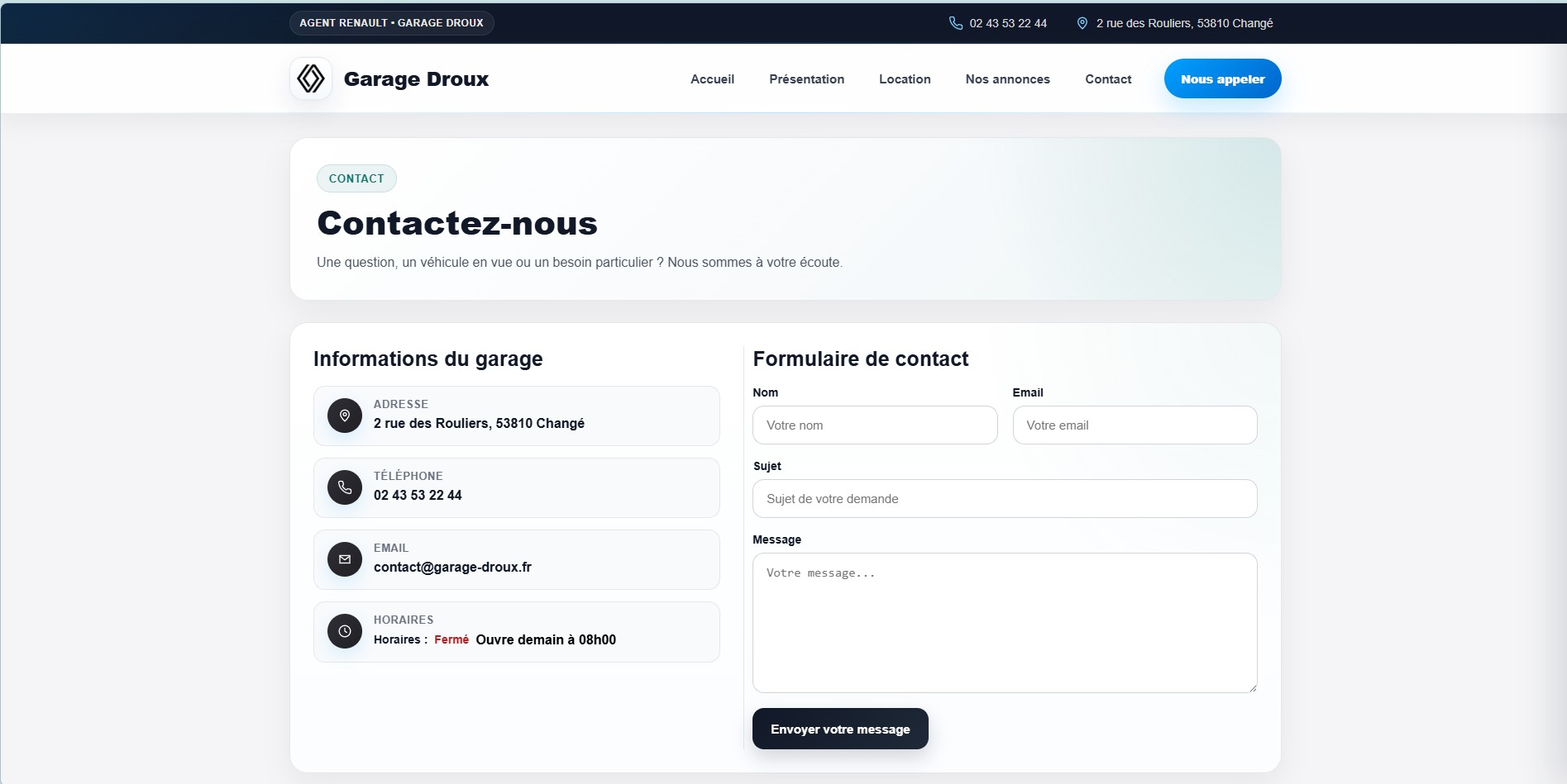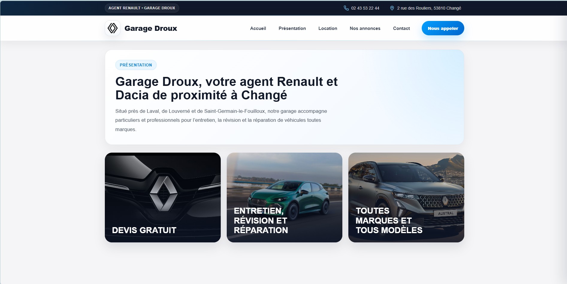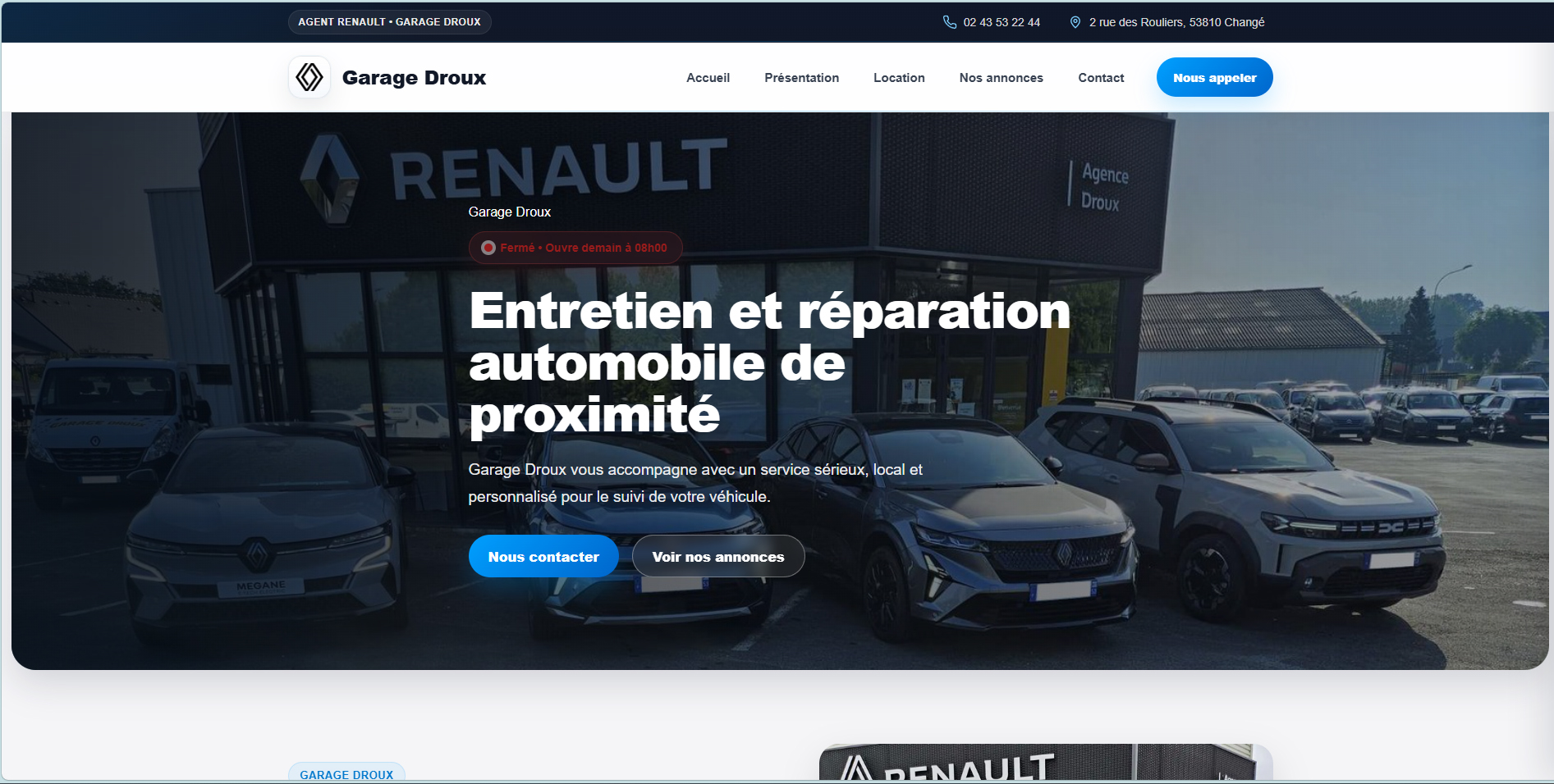 Développement du site Garage Droux en Next.js avec mise en place de fonctionnalités sur mesure et d’une application Android connectée permettant de publier les annonces du garage directement depuis mobile.