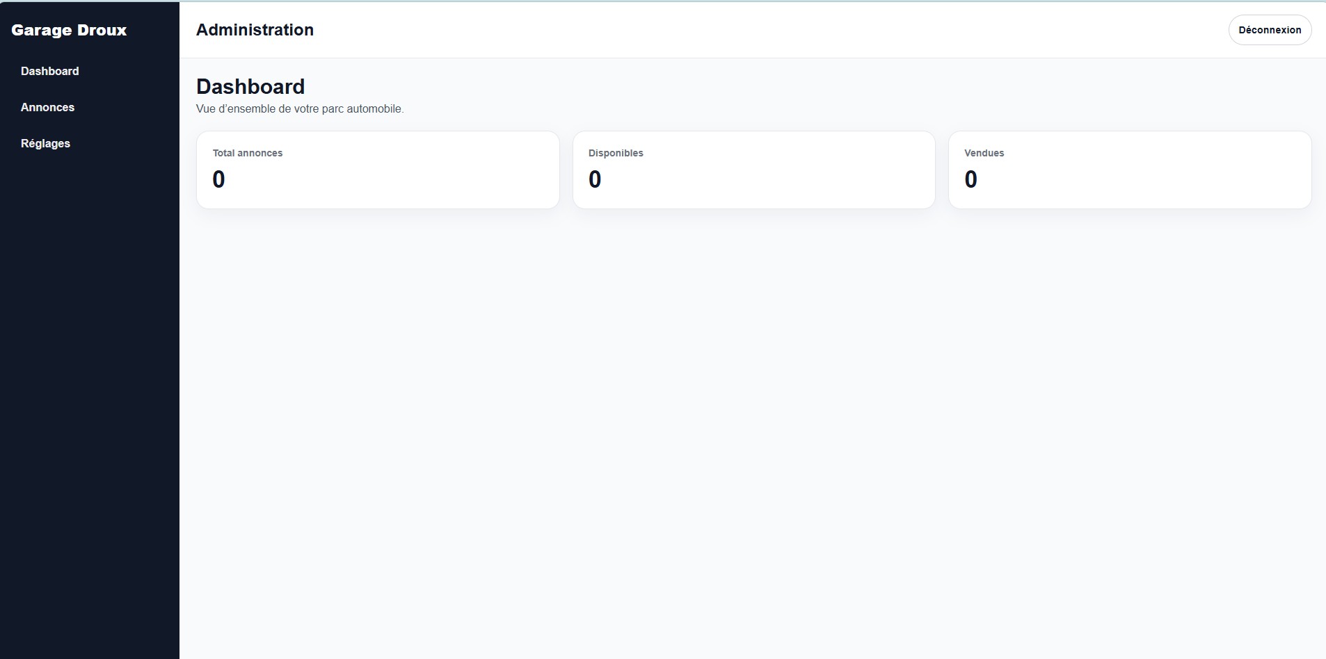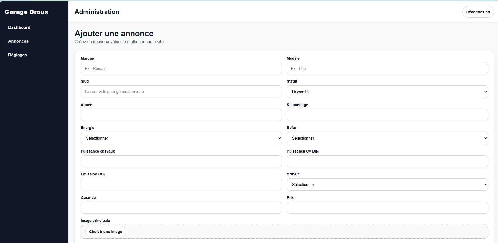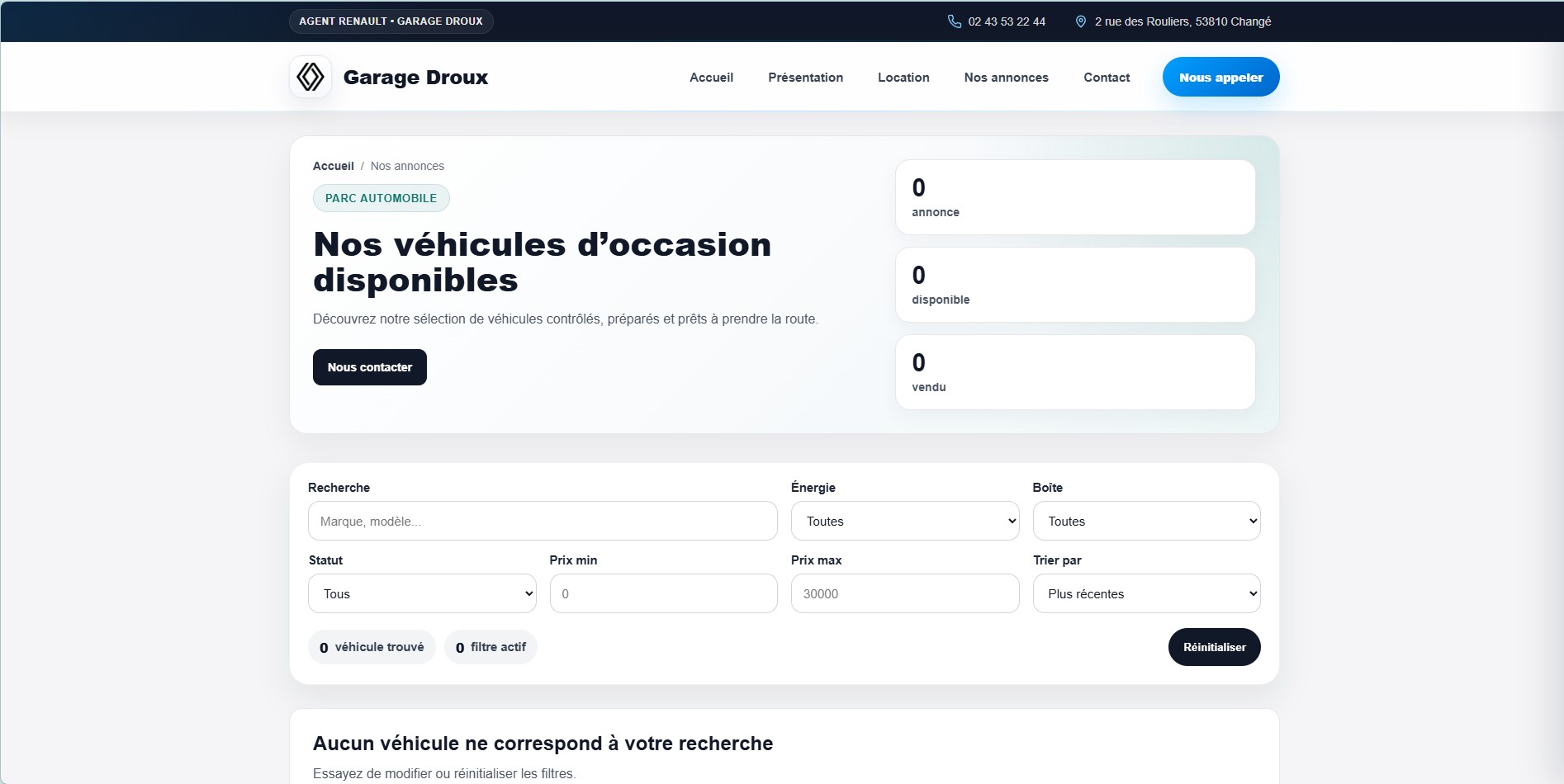 Le projet inclut également une application Android reliée au site, permettant au garage de publier, gérer et mettre à jour les annonces directement depuis mobile, sans passer systématiquement par un ordinateur.